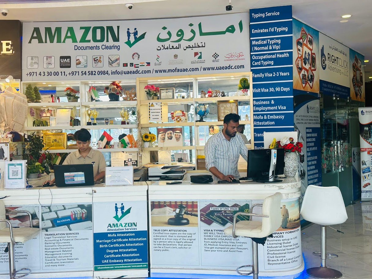 Amazon DC provide all kind of documents clearing Services with best pro service and very competitive price,Our best pro services for your documents clearing service and processingNew business setupInstant License,Trade Name Registration ,New Issue License,Renew License,Reserve / Renew Trade Name,Issue Initial Approval,License Modification,New license applyingNew license processingPay Inspection Fines, etcTasheel Services / Ministry of Labour Services / Typing services / Emirates ID Services/Medical Authority Services/ Insurance services / MOA & POA / Legal Translation / Attestation Services / Documents clearing / Photo copy center / Email / scanning Etc..We are provide Global Legalization Services. With strategic office locations and large network of trusted agents, franchises and business associates, Amazon, is able to offer legalization services from more than 60 countries at a very competitive price.Our services :Educational certificates / degree certificates / Birth Certificates , Marriage certificates / Death Certificates / Divorce, single status certificate / Certificate of No-Impediment / Civil Partnership certificate / Change of name certificates / Power of attorney / police clearance certificate all with certified language translations and legal Translation services .Free pickup and drop off services & many more.