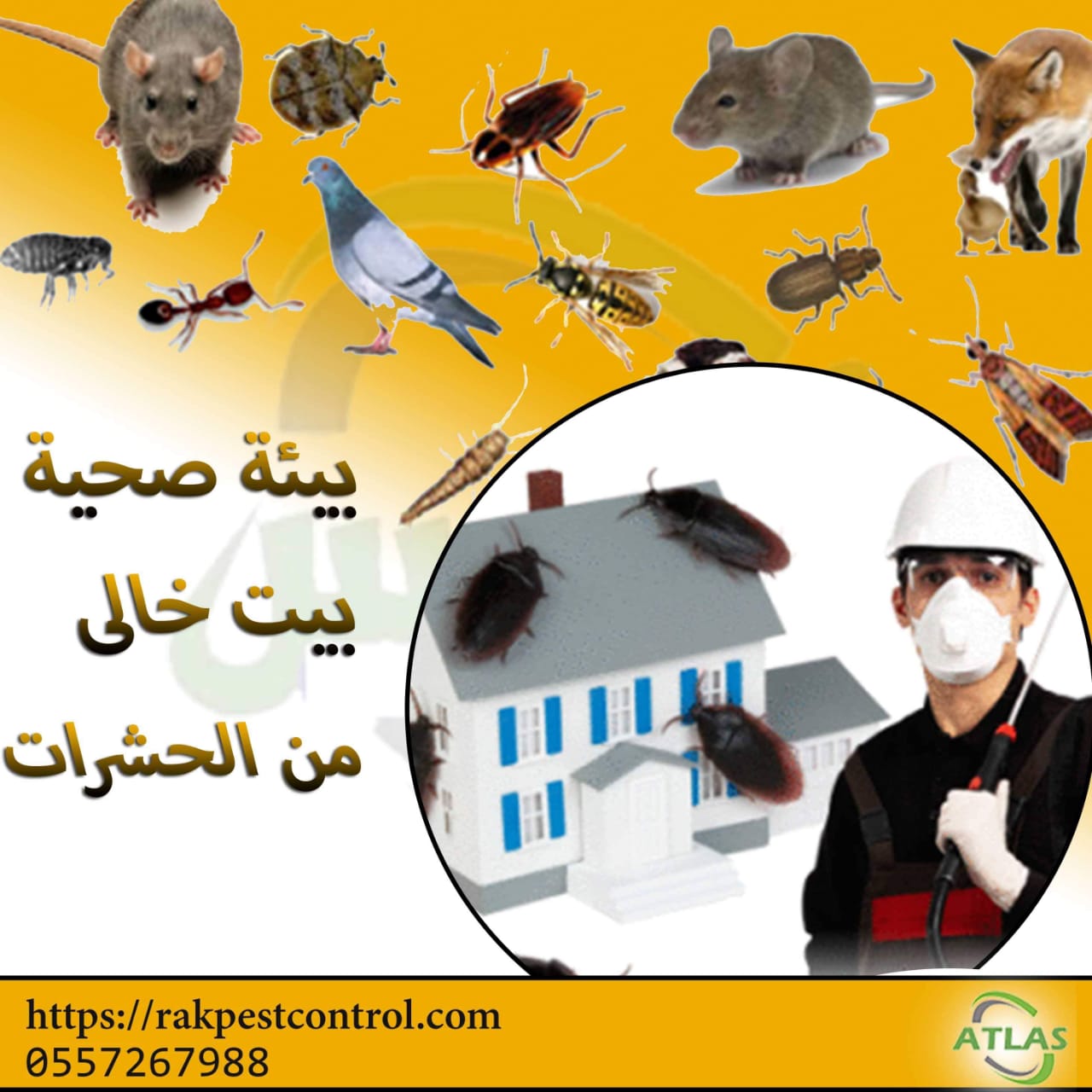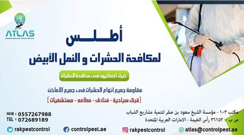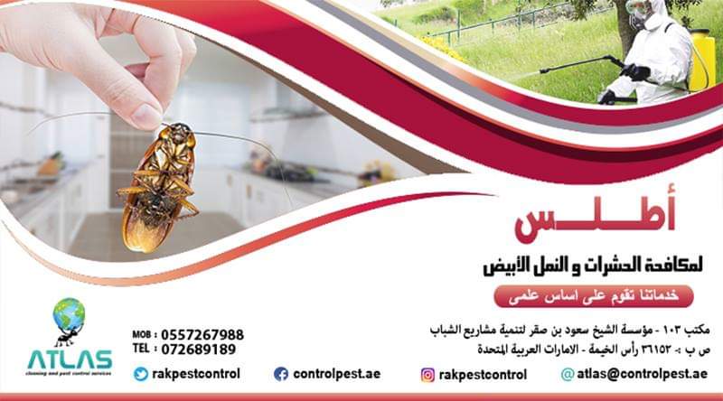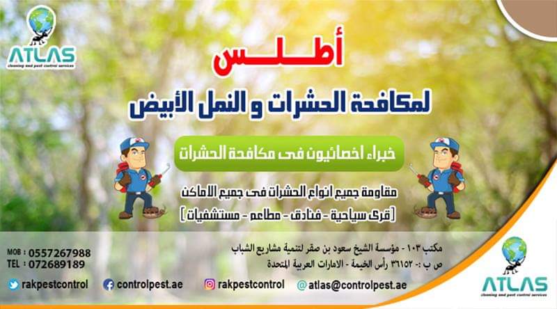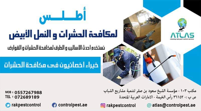Atlas Services (Cleaning & Pest Control in ras al khaimah ) We Provide a wide range of A-Cleaning Services - General Cleaning Services - COMMERCIAL CLEANING - CARPETS & WINDOWS - FLOOR SERVICES -all kinds of floors - CONSTRUCTION CLEAN UP - for new construction and remodel cleaning. Window cleaning presents a lot of challenges in removing construction dust, debris, paint, joint compound, stucco, etc. from windows and frames without scratching. - PRESSURE CLEANING -------------------------------------------------------------------------------- B- Pest Control Services -Cockroaches Control -Ants Control -Rats Control -Birds Control -Bed Bugs Control -Anti Termite Treatment -Bed Bugs Control -Ticks Control -Carpet Treatment ( Recommended for the protection of valuable carpets against carpet beetles , moths and textile pests Atlas Services is ISO Quality Registered شركة مكافحة حشرات رأس الخيمة – الإمارات تعتبر من إحدى الشركات المتميزة، معتمدة بيئيًّا من الجهات الحكومية المختصة في رأس الخيمة فنتبع أفضل أساليب و طرق التخلص من حشرات المنزل وكذلك أفضل معايير وقاية أساسات البناء ضد النمل الأبيض، حيث لدينا المعرفة والخبرة وأيضا الدراسات المتقدمة في مجال مكافحة الحشرات و رش المبيدات بأنواعها حيث نقدم خدماتنا للعديد من القطاعات الغذائية والخدمية والصناعية و داخل المنازل أو الشركات في رأس الخيمة وأم القيوين – الفجيرة وفي جميع أنحاء الإمارات . عملية مكافحة الحشرات تعتبر أسلوب وطريقة يقوم بها أشخاص مدربون وعلى دراية تامة سواء باستخدام المبيدات بشكل سليم وآمن وأيضا على دراية بالمشاكل والأضرار التي تسببها انتشار حشرات الصحة العامة من الناحية البيئية أوالصحية أو من ناحية الأضرار التي تسببها للمتلكات حيث يجب أن تتم عملية مكافحة الحشرات بشكل آمن بحيث لا يؤثر على صحة الموجودين بالمكان وأيضا يجب أخد الاحتياط والحذر عند العمل بالقرب من أي مواد غذائية . من الجدير بالذكر أن عملية مكافحة الحشرات المنزلية ليست مجرد رش كيماويات مخلطه بالماء لقتل الحشرات فحسب ، فينبغي أن يكون الشخص القائم عليها متفهم جيدا لكيفية استخدام المبيدات الحشرية وذلك بمعايير ومقادير معينة فتعتبر مبيدات الحشرات سموم شديدة والاستخدام الخاطئ لها أو الاستهانة باستخدامها وكذلك عدم إتباع تعليمات الصحة والسلامة المهنية قد يؤدي الى خسائر بشرية . لذلك عزيزنا العميل إذا قررت التعامل مع شركة رش مبيدات الحشرات فلابد وأن تسأل عن مصداقية تلك الشركة فإذا لم تستطيع، يمكنك أن تستفسر عن شركة رش المبيدات من خلال أي جهة حكومية مثلا البلدية أو الدائرة الإقتصادية وأيضا اتصالك برقم أرضي يزيد من نسبة الاطمئنان لديك أن الشركة لها مقر يمكنك التعامل معهم في حالة الضرورة وأيضا يمكنك الاستفسار عن طريقة العمل وكيفية أداء تلك العملية بعد قبل أن تشرح مشكلتك بكل بساطة وردك على أسألة الشخص المسؤل عن مكافحة الحشرات حيث سيساعد ذلك بنسبة كبيرة في طريقة التخلص من الحشرات وتحقيق النتائج المرغوبة .