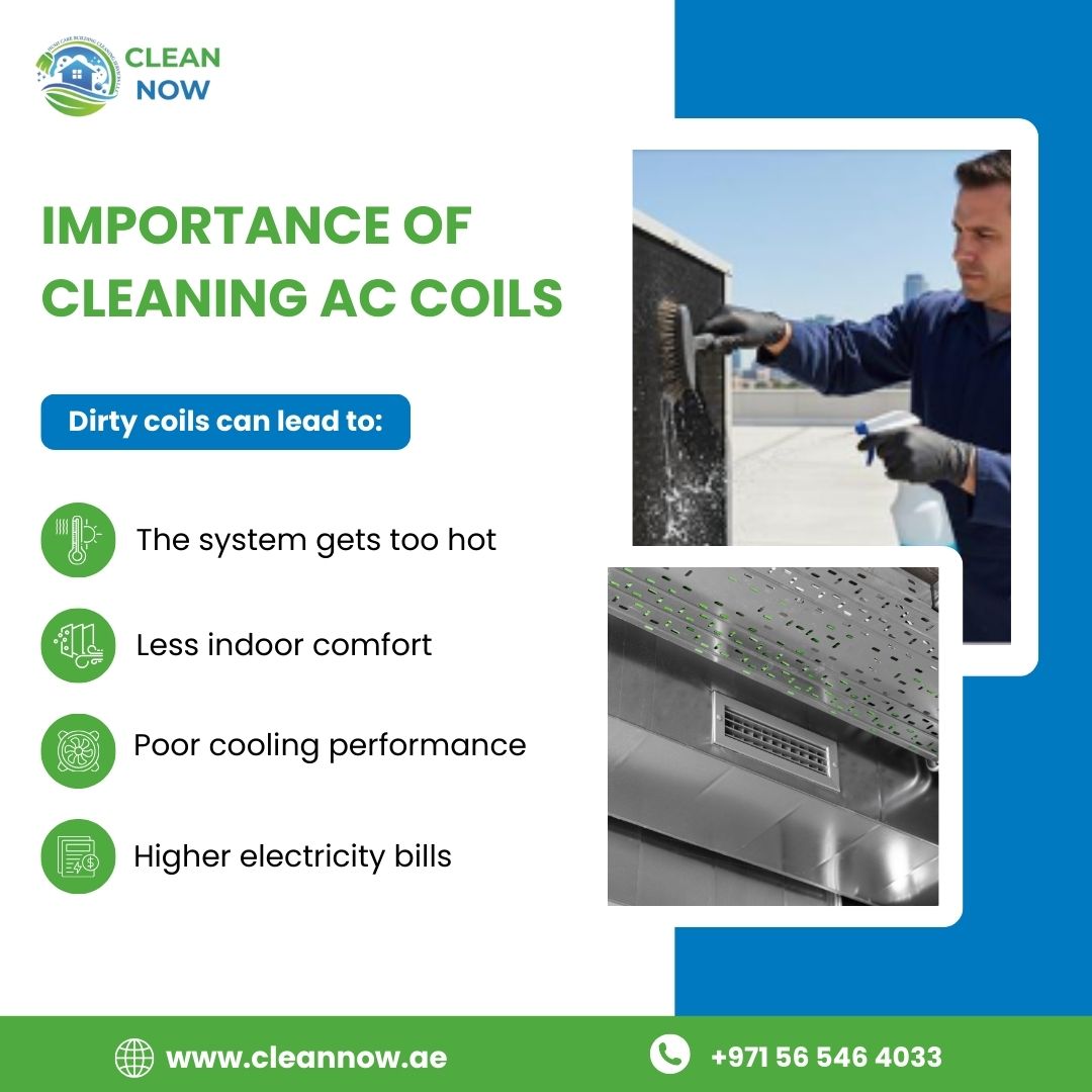 Regular AC Coil Cleaning in Dubai is essential to keep your air conditioning system running efficiently, especially in the UAE’s hot climate. Dirty AC coils restrict airflow, force the system to work harder, and reduce cooling performance. When coils are not cleaned on time, it can lead to overheating, poor indoor comfort, and increased electricity bills. Professional AC coil cleaning helps improve cooling efficiency, extend AC lifespan, and ensure healthier indoor air. Choose expert AC Coil Cleaning in Dubai to enjoy better cooling, energy savings, and long-lasting AC performance.