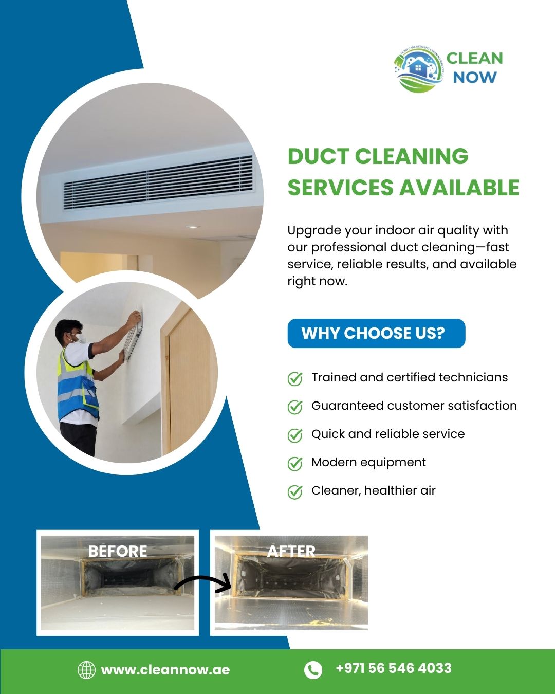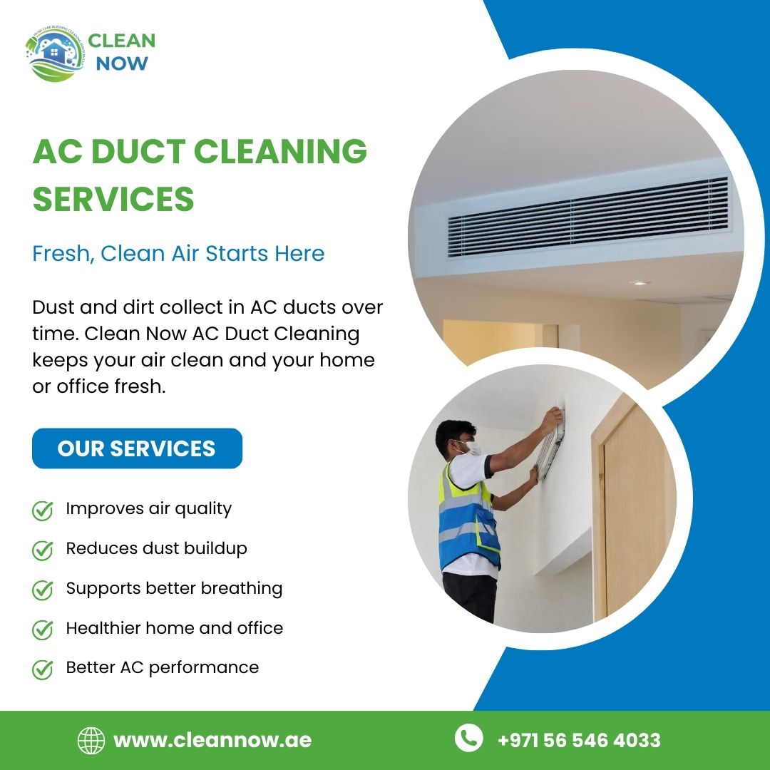 Dust, dirt, and allergens build up inside your AC ducts over time—affecting your air quality and cooling performance. Our expert team ensures deep, professional cleaning for fresher indoor air and better AC efficiency. ✅ Trained & certified technicians ✅ Advanced cleaning equipment ✅ Visible before & after results ✅ Quick, reliable service Choose Clean Now for trusted AC Duct Cleaning in Dubai and enjoy a cleaner, healthier environment for your home or office.