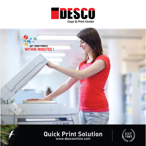 DESCO offers Printing services in Abu Dhabi & Dubai. DESCO has been here in UAE for nearly 30 years and has now expanded to 40 branches in Dubai and Abu Dhabi so it is easy to find a print center nearby.For more information kindly call on our toll free number: 800 DESCO (800 33726) or visit our nearest print centers.