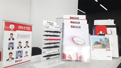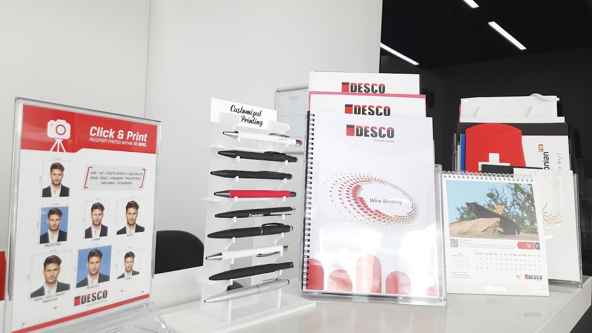 Desco Copy & Print Center is your one-stop solution for all printing needs. We offer a wide range of services, from business cards, roll-up banners, form boards, and large-format prints to specialty options like gold foil and embossing. We specialize in UV printing, laser engraving, and various promotional item printing, including mugs, pens, water bottles, USBs, paper bags, and more. Our professional photo studio handles everything from headshots to passport, visa, and Emirates ID photos, with a dedicated team for kids and newborn photography. We also provide custom rubber stamp-making and key duplication services. At Desco, we’ve got you covered!