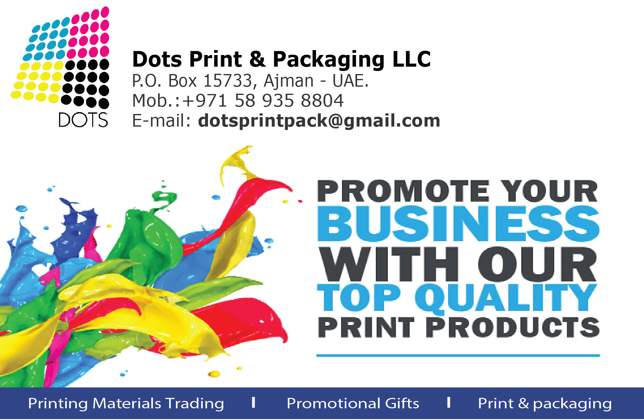 “Dots Printing Materials Trading” is a professional binding and printing materials supplier based in Ajman, UAE. ‘Dots’ was established in the year 2007, and ever since we have strived to establish ourselves as one of the leading companies in the printing and binding industry. We provide a range of solutions including the supply of Paper & Board, Printing Materials, Consumables, and other accessories throughout UAE. All our products are consistently tested for their high quality and durability, and are priced at an affordable rate. ‘Dots’ has a team of highly qualified employees, whose experience and expertise help to manage our operations efficiently and also support our customers with technical advices about our products. We constantly keep an eye on the recent developments and technical advancements in the industry, in order to meet the new requirements and demands of our clients.