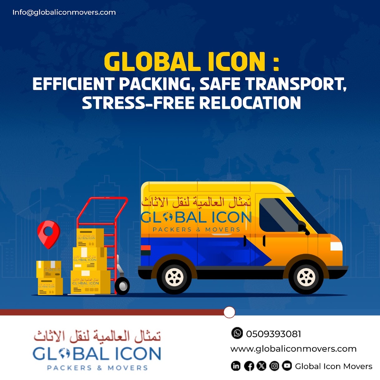 Global Icon Movers offers secure and affordable storage service in Abu Dhabi, designed for households and businesses that need extra space. With climate-controlled units, 24/7 security, and flexible plans, we make storing your belongings simple, safe, and stress-free.Global Icon Movers is a trusted relocation and storage service provider in Abu Dhabi, offering reliable moving, packing, and warehousing solutions for individuals and businesses. With years of experience in the UAE logistics industry, we specialize in local and international moves, office relocations, and short- or long-term storage options.