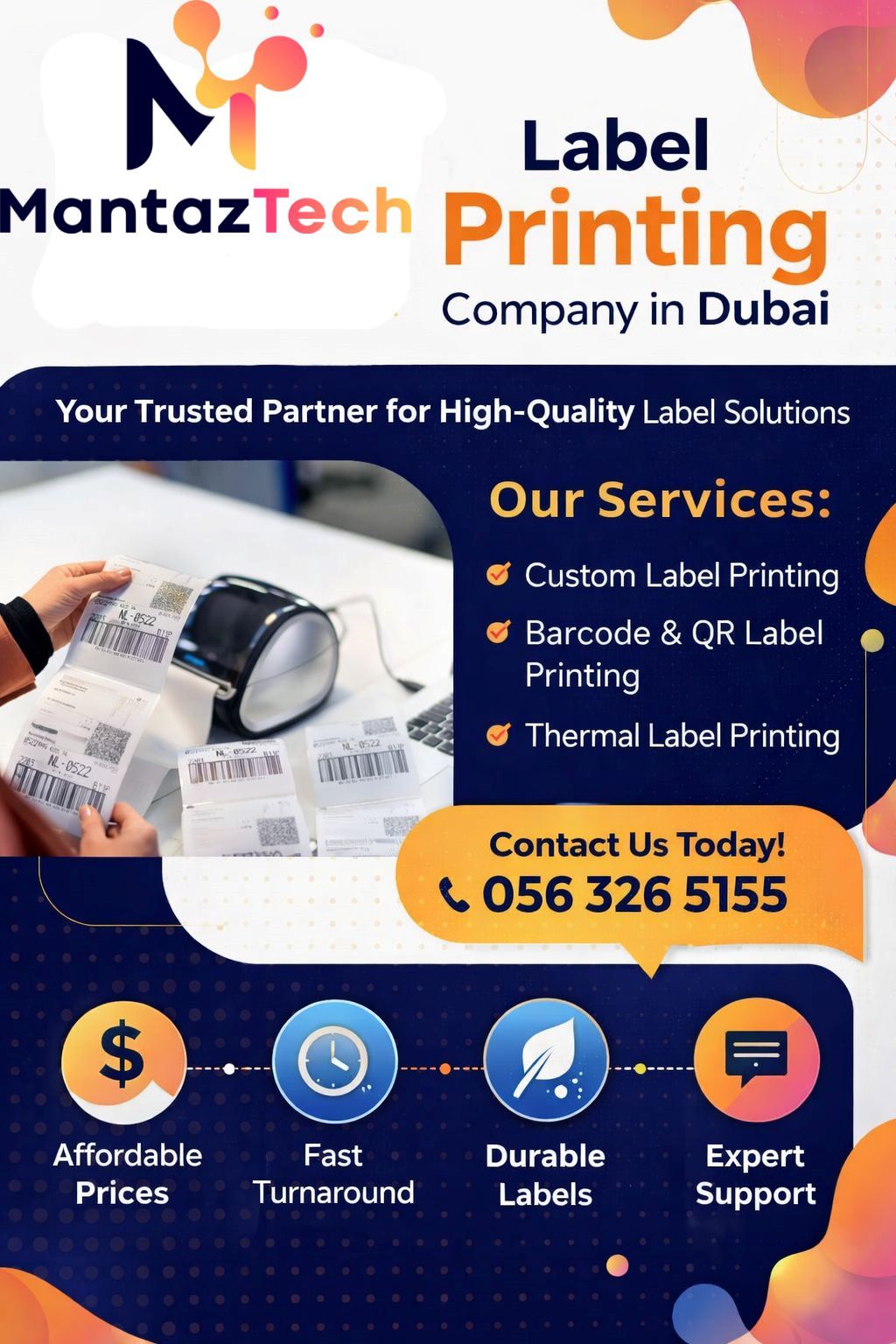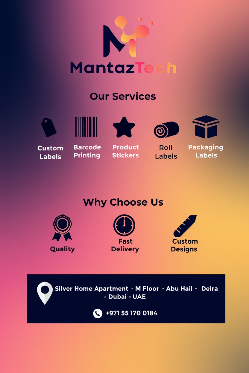Mantaz Technologies LLC is a trusted barcode labels supplier UAE, delivering high-quality labeling solutions for businesses across retail, logistics, warehousing, and manufacturing sectors. The company provides durable and customizable barcode labels designed to improve product identification, inventory control, and operational efficiency. With reliable materials and precision printing compatibility, these labels support smooth scanning and accurate tracking in daily business operations. Mantaz Technologies LLC focuses on providing dependable barcode labeling solutions that help businesses streamline workflows, reduce errors, and maintain organized inventory systems throughout the UAE.