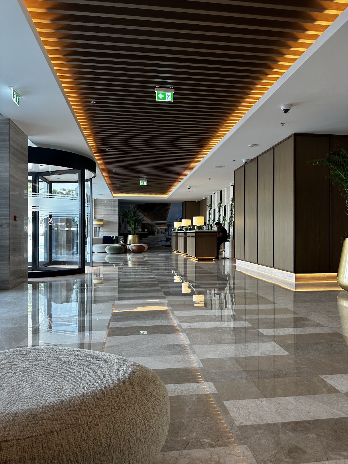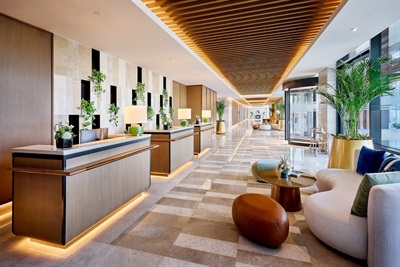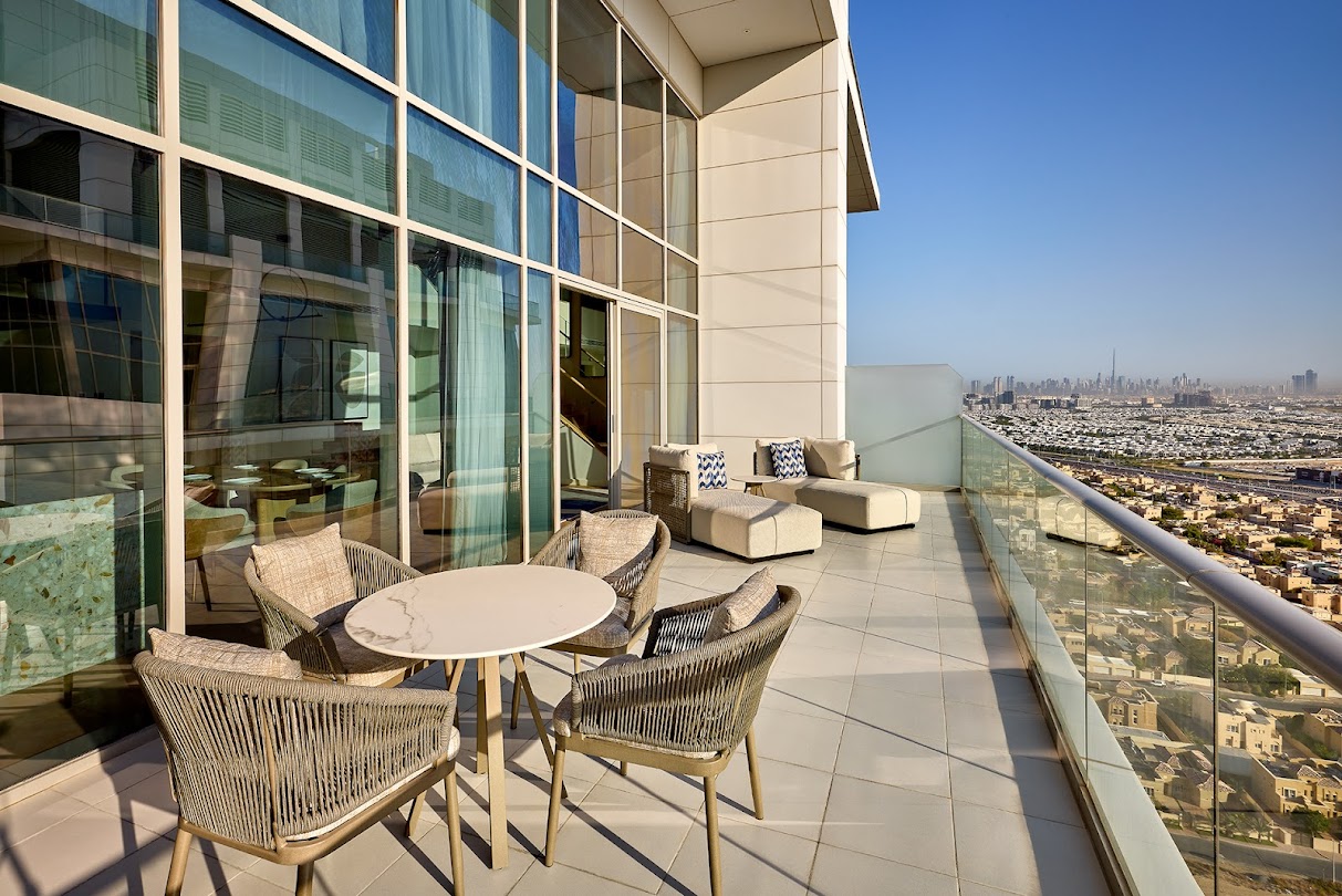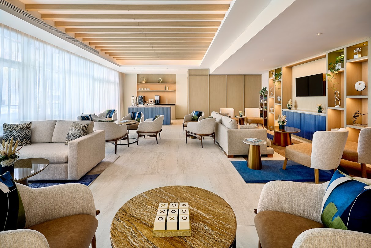 Marriott Residences Al Barsha South, Dubai offers panoramic views of the Burj Khalifa and Burj Al Arab. The residences, located in the vibrant Al Barsha South, are designed to provide a peaceful retreat from city life. The furnishings combine green and beige tones with delicate arabesque details to create a pleasant, modern look. Natural elements such as wood, stone, and leather create a sense of richness, while the overall design draws inspiration from adjacent golf courses and equestrian clubs.