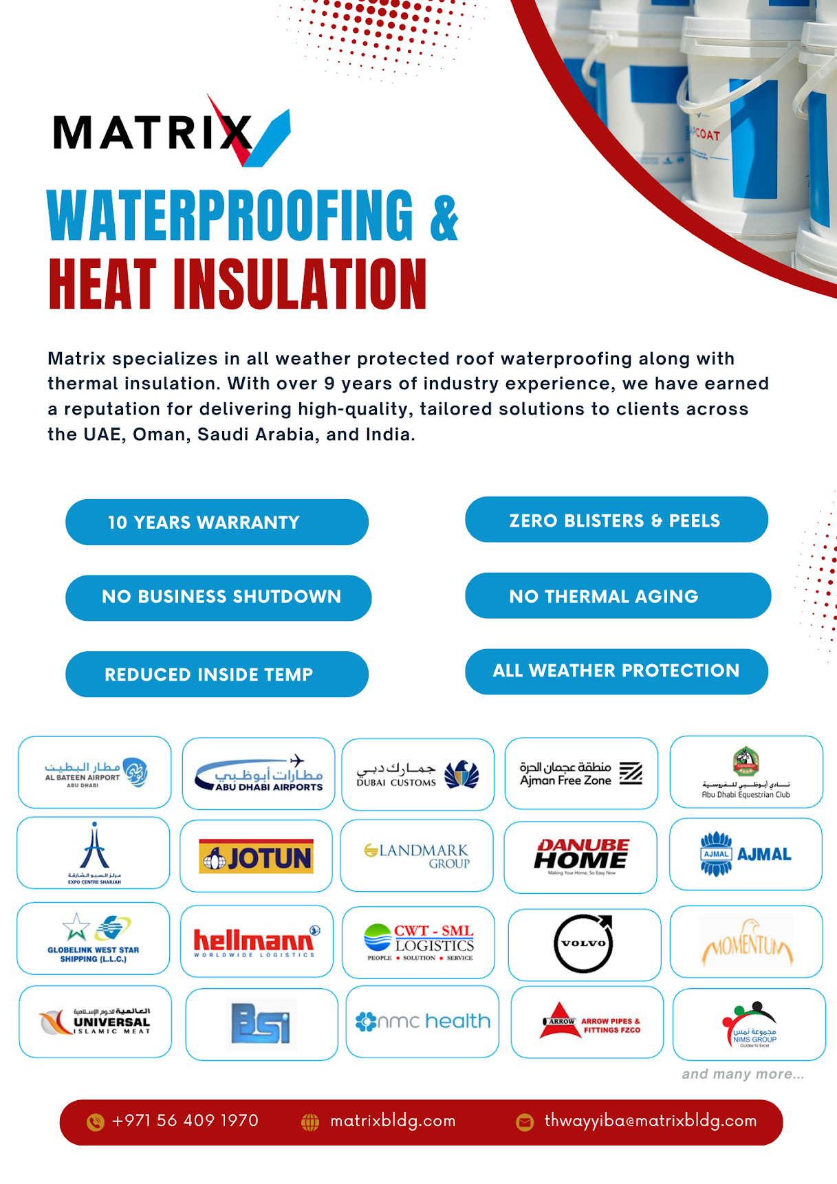 Matrix focuses on waterproofing and wall coating systems. We provide high-performance, eco-friendly solutions like Matrix Cool Roof. We protect roofs and walls from harsh weather. Our methods are cost-effective and high quality. Moreover, our solutions help prevent water leaks and reduce roof aging, saving energy in the process.