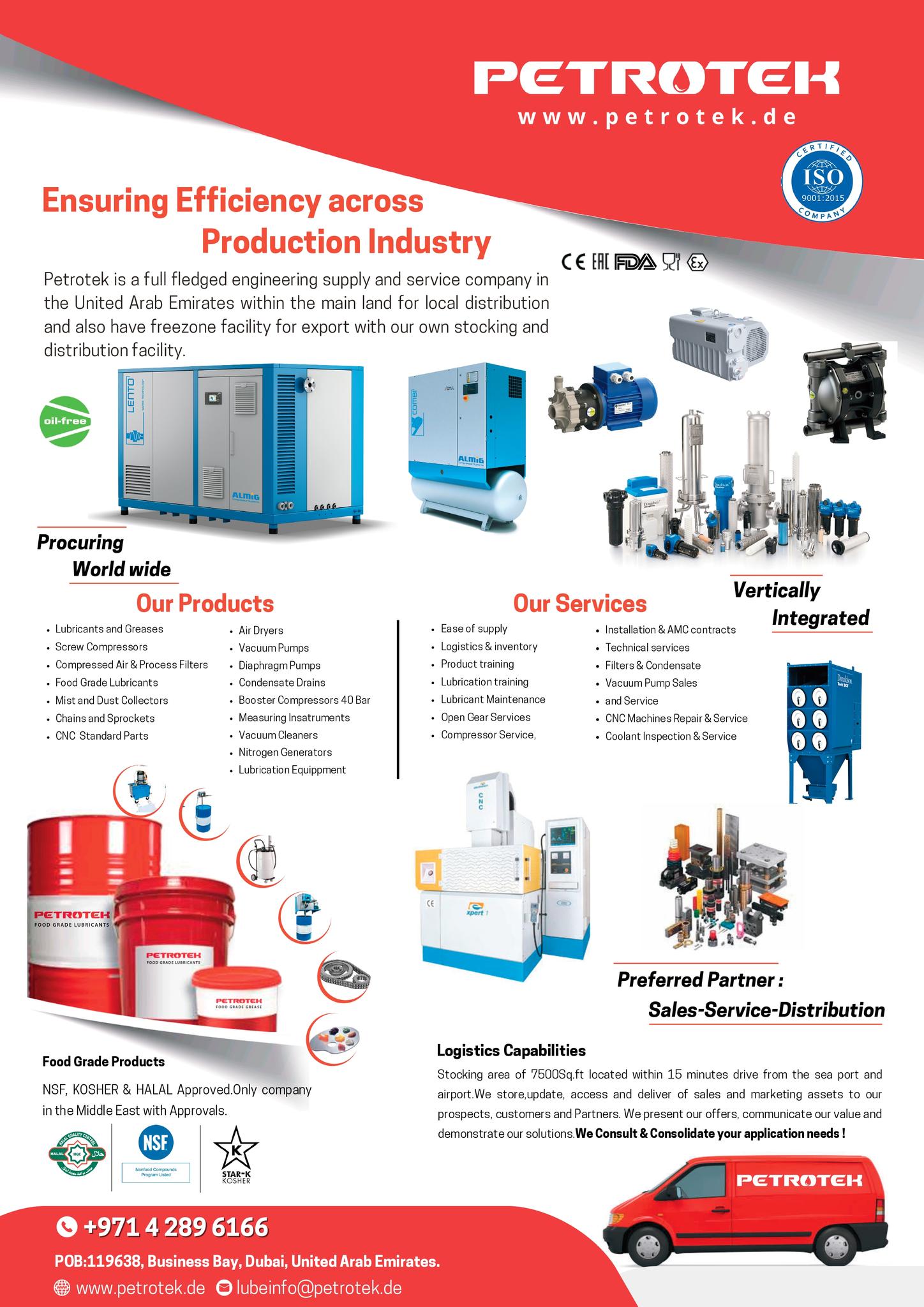 Petrotek is the top and leading lubricants supplier in the UAE, established in 2007 delivering a wide range of high-quality oils, greases, and industrial maintenance products to meet the needs of the automotive, manufacturing, marine, construction, and agricultural sectors. With Machineries Like CNC Machines , Screw Compressors , Lubrication Equipments , Refrigeration Dryers , Compressor Service , Nitrogen and Oxygen Generators , Lubrication Equipments , Diaphragm Pumps , Vacuum Pumps , Coupling and a Variety of Industrial Products in Stock We are an Industrial trading Company with operations in UAE to stock and distribute various engineering related products and solutions . With our worldwide supplier network, we stock and distribute products to the continuous production areas and engineering industries. We supply to all major industries and have the expertise and resources to address the technical and commercial issues.