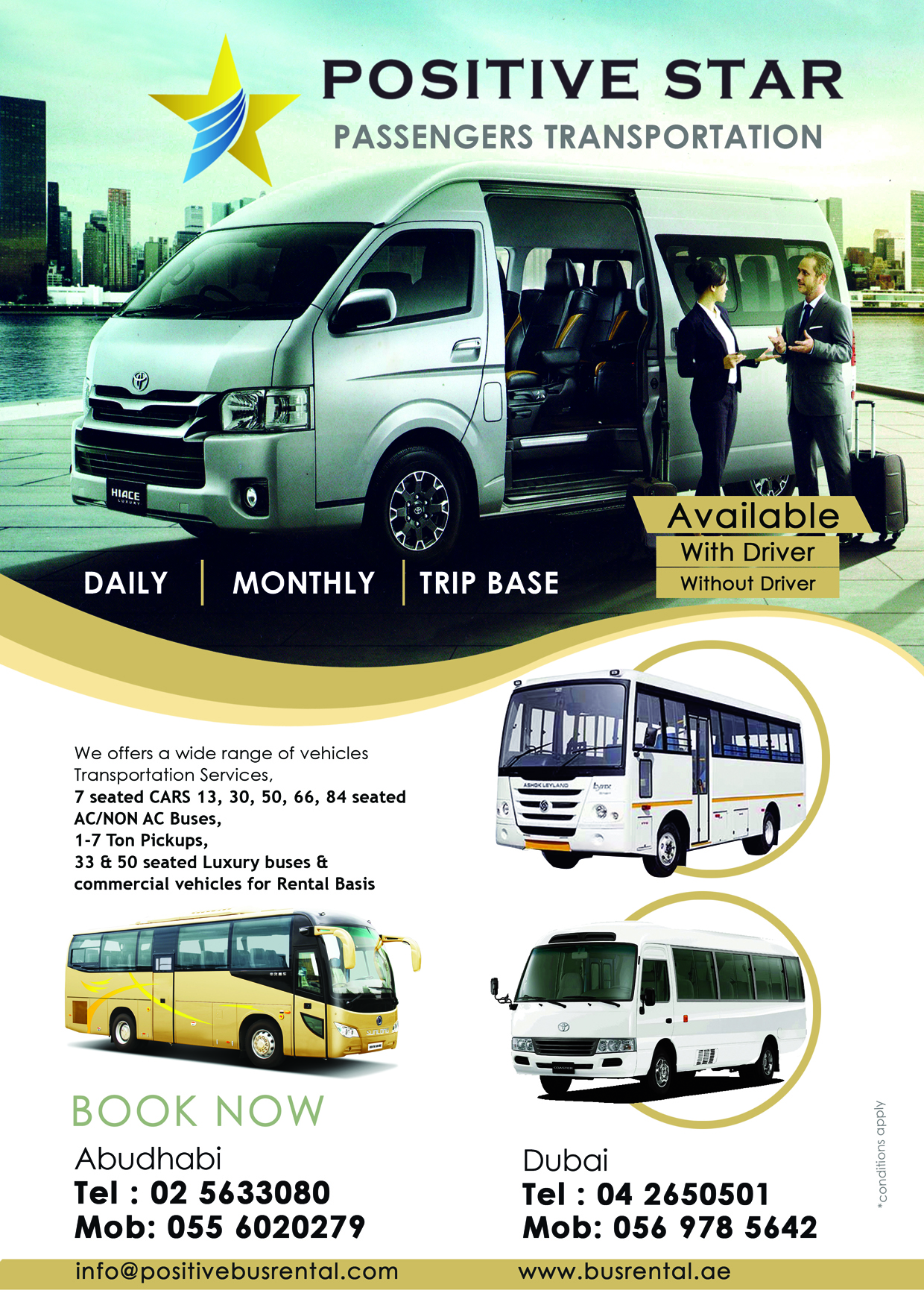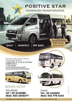 We offers a wide range of vehicles Transportation Services, 7 seated CARS 13, 30, 50, 66, 84 seated AC/NON AC Buses, 1-7 Ton Pickups, 33 & 50 seated Luxury buses & commercial vehicles for Rental Basis For Enquiry : Abudhabi Tel : 02 5633080 Mob: 055 6020279 info@positivebusrental.com positivetransport@gmail.com www.busrental.ae