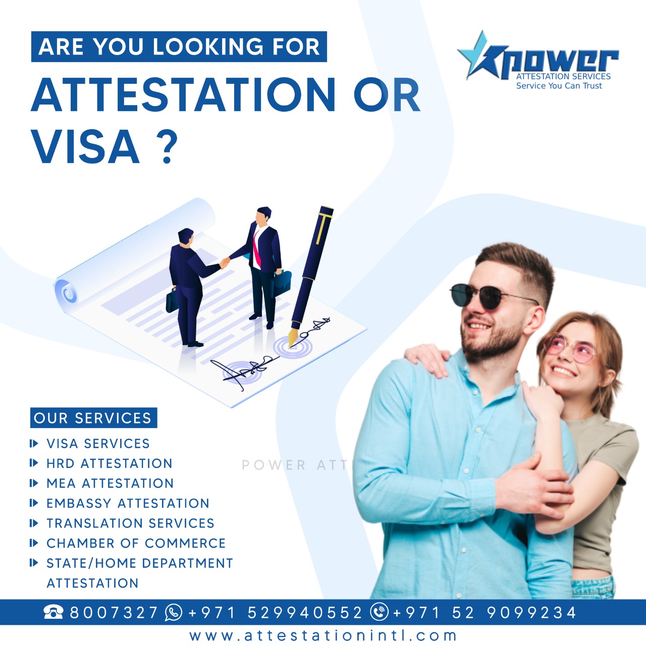 We are international business service agents with A grade in the reliability report, The trust from customer all over the world has made us what we are now. Power Attestation Services provides professional document attestation services. We assist Clients to obtain an attestation or embassy legalization for their documents & certificates. An attestation or embassy legalization certifies the authenticity of documents and are notarized before they can be accepted by Government & Business Establishment.