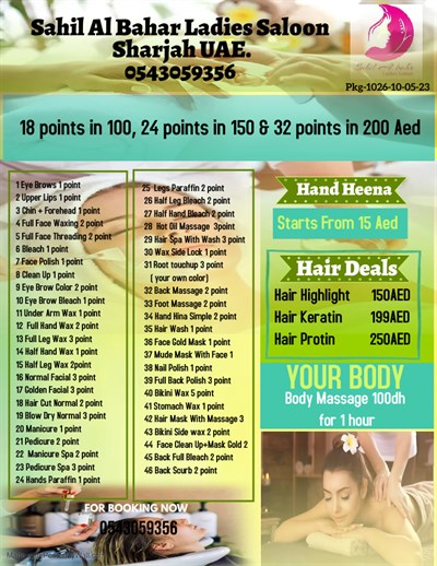 Dar bushra Ladies Beauty Center offers quality services to make women beautiful in a reasonable prices. . . . . . . .Our service "for women providing beauty & Sharjah. Manicure Pedicure Body waxing Bo