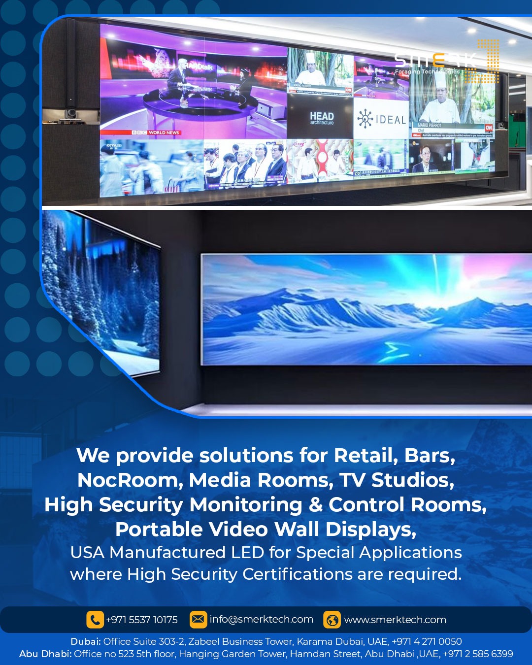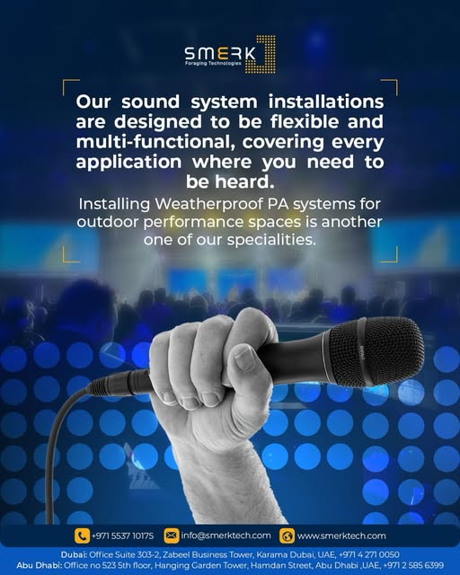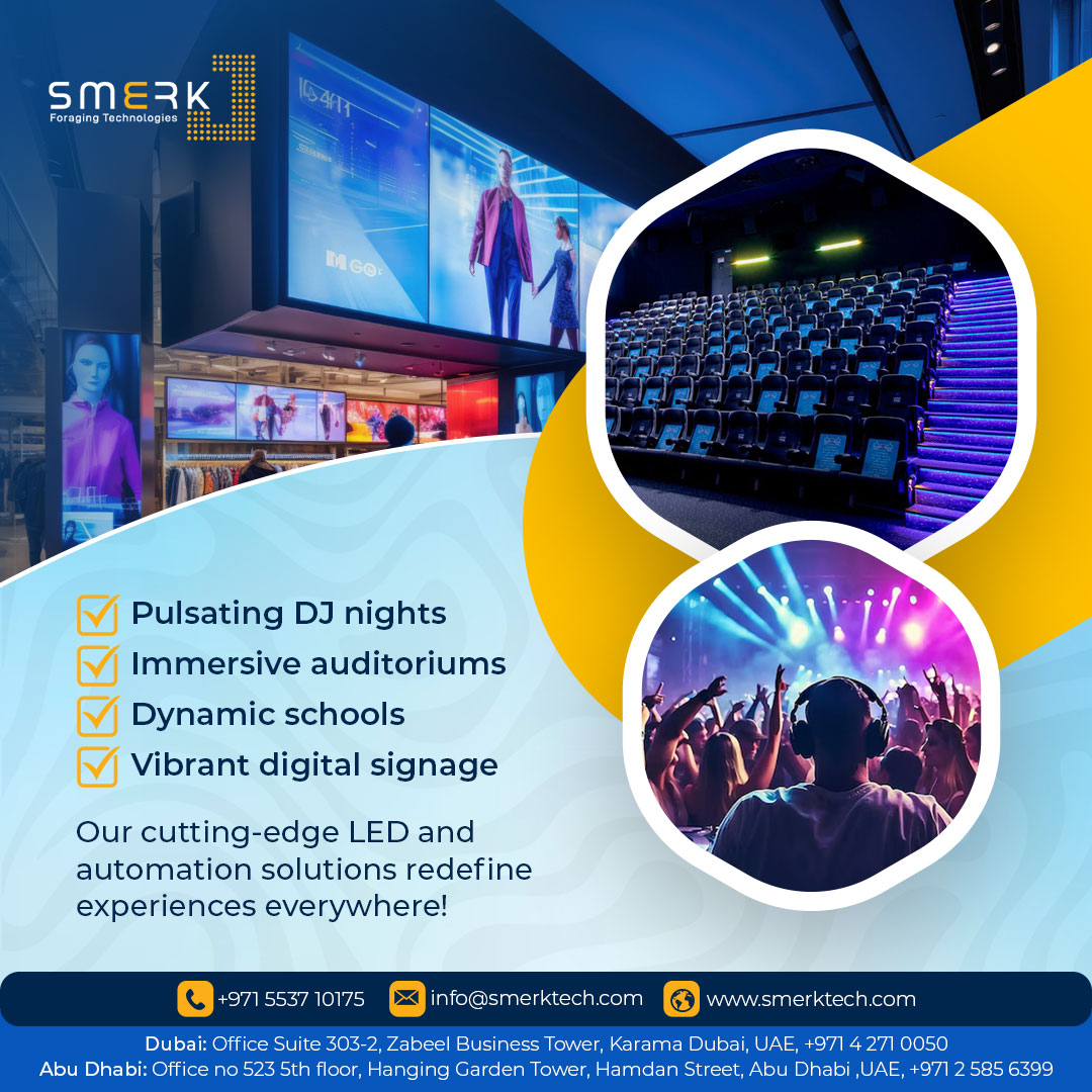 SMERK Technologies LLC is a leading audio-visual integration company based in Dubai, UAE, specializing in delivering cutting-edge AV solutions tailored to the unique needs of residential, commercial, and institutional clients. Established in 2020, SMERK has rapidly gained recognition for its commitment to quality, innovation, and precision in the AV industry.At SMERK, we understand that effective communication and seamless integration are paramount. Our team of skilled professionals offers comprehensive services, including design consultation, system integration, and ongoing support, ensuring that each project is executed with the highest standards of excellence.Whether you're looking to enhance your home with smart automation, equip your office with state-of-the-art conferencing solutions, or transform your educational space with interactive technologies, SMERK Technologies is your trusted partner in bringing your vision to life.