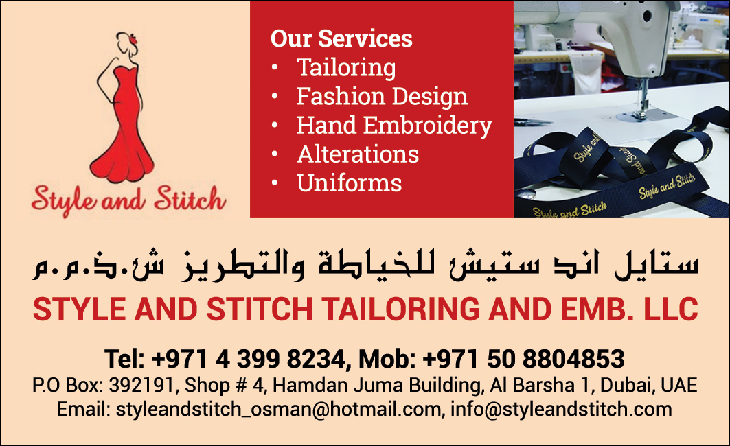 Style and Stitch is not only a tailoring service but a cozy place where you feel at ease and where your vision for your dress is sewn into perfection the way you want by our dedicated and professional staff. Our team takes great care in making your dream dress come to life. Our masters and designers are passionate about their work, so every dress is a unique creation. Every woman is beautiful and unique in her way, our designers/masters at style and stitch takes utmost care in designing the perfect dress to enhance your beauty and elegance. Our team consists of masters and designers from different nationalities with an experience of 25 years and they specialize in couture dresses, Pakistani, Arabic, Indian, and Western dresses as well as abayas and Hand embroidery.